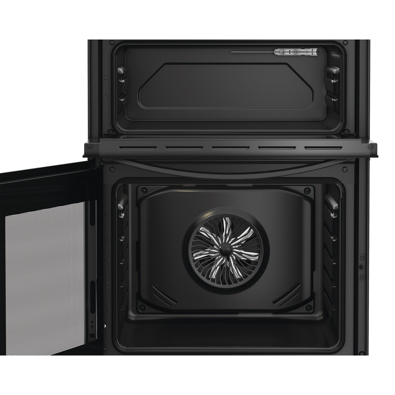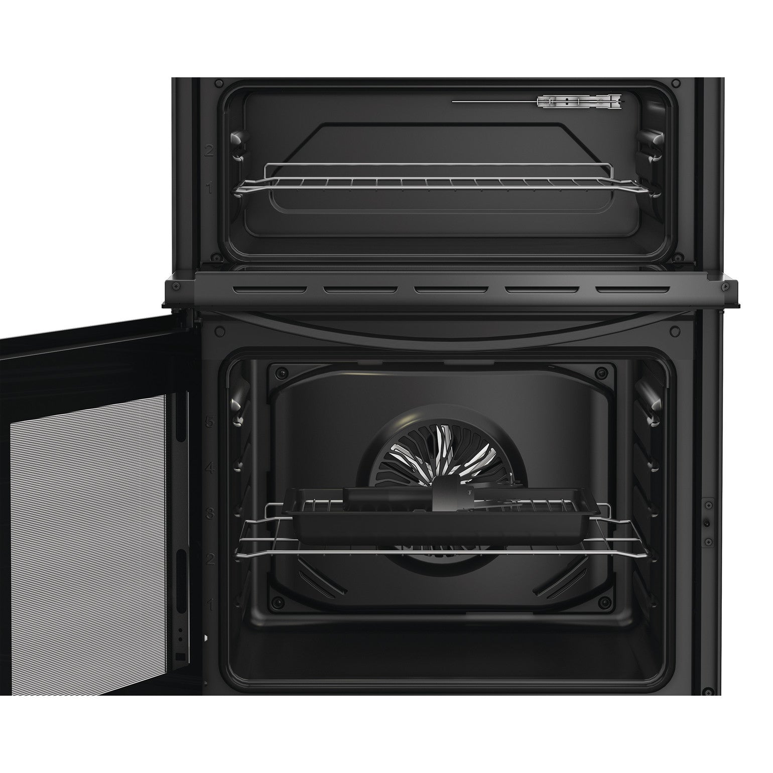 - Door designs — top cavity door opens via a convenient drop‑down mechanism; bottom oven door opens to the side, providing easy access even in compact kitchens.