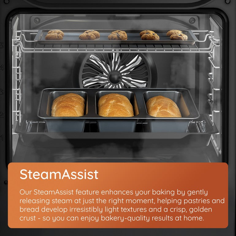 Below sits a spacious 75‑litre electric fan oven, ideal for multi‑course meals or batch cooking. The fan circulates hot air for even temperatures across the entire cavity, helping you bake cookies on one shelf while roasting vegetables on another. This cavity also benefits from cleaning liners and a side‑opening door for convenient access in tighter kitchens. Diamond Clean steam cycle adds a deeper, chemical‑free clean when you want it, softening baked‑on residues for an effortless wipe afterwards.