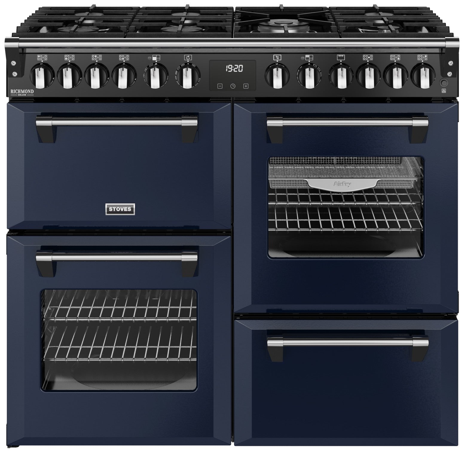 Introducing the Stoves Richmond Deluxe 100DF 100cm Dual Fuel Range Cooker in a stunning Midnight Blue finish. This elegantly designed cooker combines style with functionality, making it the perfect centerpiece for your kitchen.